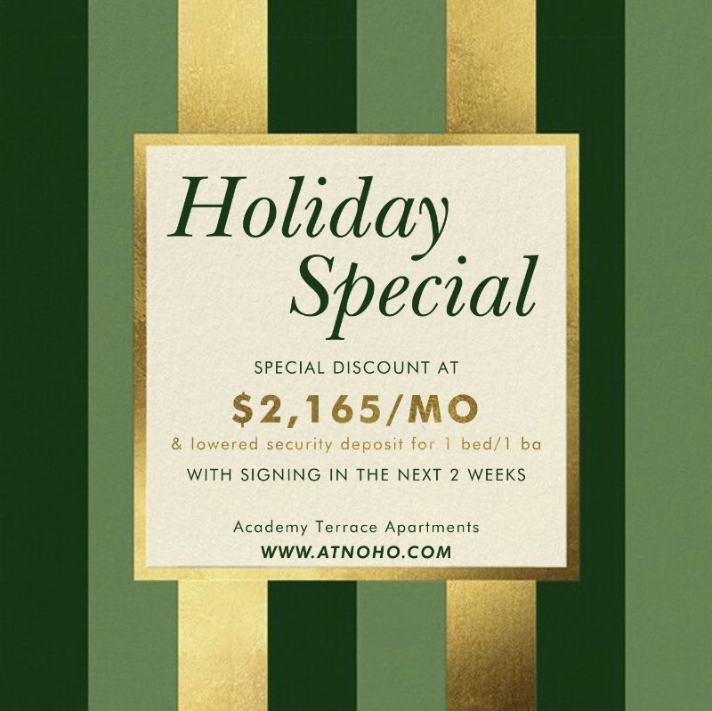 HOLIDAY SPECIAL - For a limited time, secure your new home within 2 weeks and enjoy a reduced rate of $2,165/mo PLUS a lowered $1,000 security deposit with approved credit! A place to call A TRUE HOME. Truly a one of kind jewel in the NoHo Arts District. Welcome home to Academy Terrace (www.atnoho.com). We are now showing a wonderful 1 bedroom apartment for rent in the heart of the NoHo Arts District available now. Large, south facing unit (810-880 sqft) has an open floor plan with a spacious walk-thru kitchen leading to your dining and living area with extended living room nook. Tile floors throughout, wood floor bedrooms. Spacious over-sized closet with sliding mirror doors with built-in shelves. Gorgeous granite counter tops in both kitchen and bath. Extra storage nook in bedroom with granite counter. Double-entry bathroom for privacy with you and your guests. Tiled outdoor balcony perfect for a grill, plants & cozy sitting area. Modern smooth ceilings with beautiful LED recessed lighting throughout for a variety of room lighting atmosphere options with energy efficiency. Lots of cabinet & storage space, extra hall closet. All stainless steel appliances-stove/oven + microwave + dishwasher + garbage disposal. Lots of natural light. Central AC/Heat. Cable-ready. Controlled access. Intercom system. 1 year lease. Rent: $2,165. Deposit: $1,000. PARKING INCLUDED -1 assigned garage parking space included. PET-FRIENDLY - Up to 2 pets allowed with combined weight of 40 lbs and under at maturity. Non-smoking. LAUNDRY-On-site washers/dryers (mobile app and coin operated). UTILITIES INCLUDED - We cover 100% water, gas for hot water, trash, and gardener. NO EXTRA FEES, NO HIDDEN FEES. Shown by appointment only. Call (818) 832-4551 for more information or requests. TTY-711. Equal Housing Opportunity. Prices are subject to change without notice. www.atnoho.com