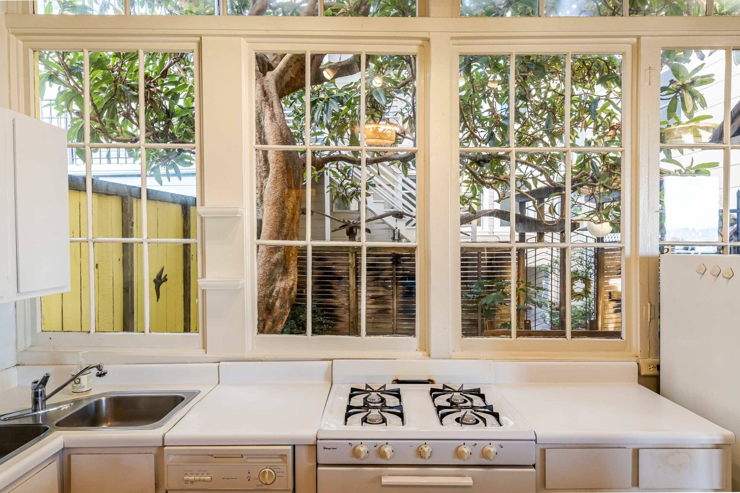 Nestled in a quiet, private setting in the heart of North Beach, this charming garden-level apartment occupies one of two units in a storybook cottage. Step into a spacious living and dining area adorned with tailored carpeting, custom built-ins, and a partial view of the Golden Gate Bridge. The open kitchen is thoughtfully appointed with a gas range, refrigerator/freezer, dishwasher, and double sinks, all framed by large paned windows that overlook the shared garden patio—perfect for morning coffee or evening unwinding. Both bedrooms feature warm hardwood floors and tranquil outlooks, while the bathroom offers a shower-over-tub and a window with a view, inviting natural light and fresh air. Downstairs, enjoy the convenience of an exclusive-use washer and dryer and a generously sized private storage room. With a stellar 99 Walk Score, you're just steps from the vibrant energy of North Beach—renowned for its eclectic mix of bars, restaurants, and boutique shops. A 91 Transit Score ensures easy access to public transportation, parks, playgrounds, and the local library.