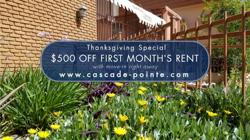 **THANKSGIVING SPECIAL - $500 OFF first month's rent with move-in right away. Gobble up this deal before it's gone! Based on approved credit** Truly a great value in an upcoming building. Spacious and at a great price. Welcome home to Cascade Pointe (www.cascade-pointe.com). We are showing a very large 1 bedroom, 1 bath available now. Great deal, great size. Large, upgraded unit under RENT CONTROL means your rental price is protected giving stability in a place you can home within our close-knit community. This large SECOND FLOOR UNIT has an open floor plan with a kitchen peaking into your dining/living area. Comes with stove, oven, microwave. Plenty of storage space and over-sized closets. Large bathroom with walk-in shower. Modern smooth ceilings with beautiful LED recessed lighting throughout for a variety of room lighting atmosphere options with energy efficiency. Extended large outdoor balcony/patio perfect for a BBQ, plants, and sitting area. AC/Heat. Ceiling fan. Lots of natural light. Newly painted. Smoke-free. Cable-ready and controlled-access. Easy access to 405 freeway. PARKING INCLUDED - 1 assigned garage parking space included. PETS: cats only. Large laundry facilities on-site. UTILITIES INCLUDED - We cover 100% water, gas for hot water, trash, gardener. NO HIDDEN FEES. 1-year lease, $1,775-$1,795/mo. Price specials are move-in right away for new tenants, rent is protected under rent-control. 810 sqft. Deposit: $1,250. Shown by appointment only. Call 818-781-2731 for more information or requests. TTY-711. Equal Housing Opportunity. ADA Compliant. Prices are subject to change without notice. www.cascade-pointe.com