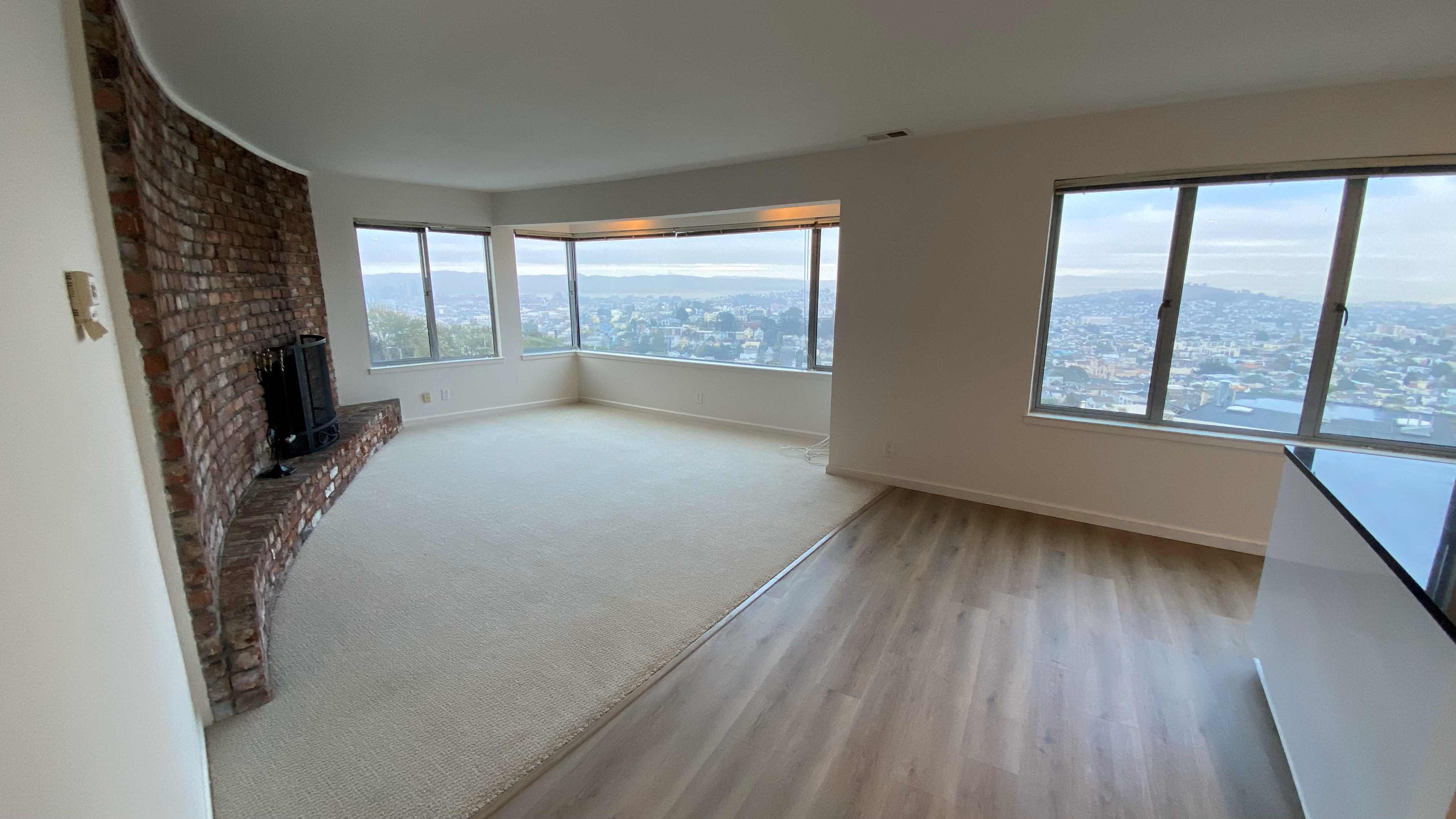 Light-filled, oversized, one bedroom corner apartment with jaw-dropping views from every window of downtown SF to the Bay and Oakland hills beyond. Fireplace with exposed brick, lots of closets and cabinets for storage. Updated kitchen with quartz countertops. - New hardwood laminate throughout - New carpet and pad in bedroom and living area - On-site property manager - On-site laundry - Muni 37 Corbett bus stops directly in front of the building - Water and garbage included in the rent - Rent controlled building