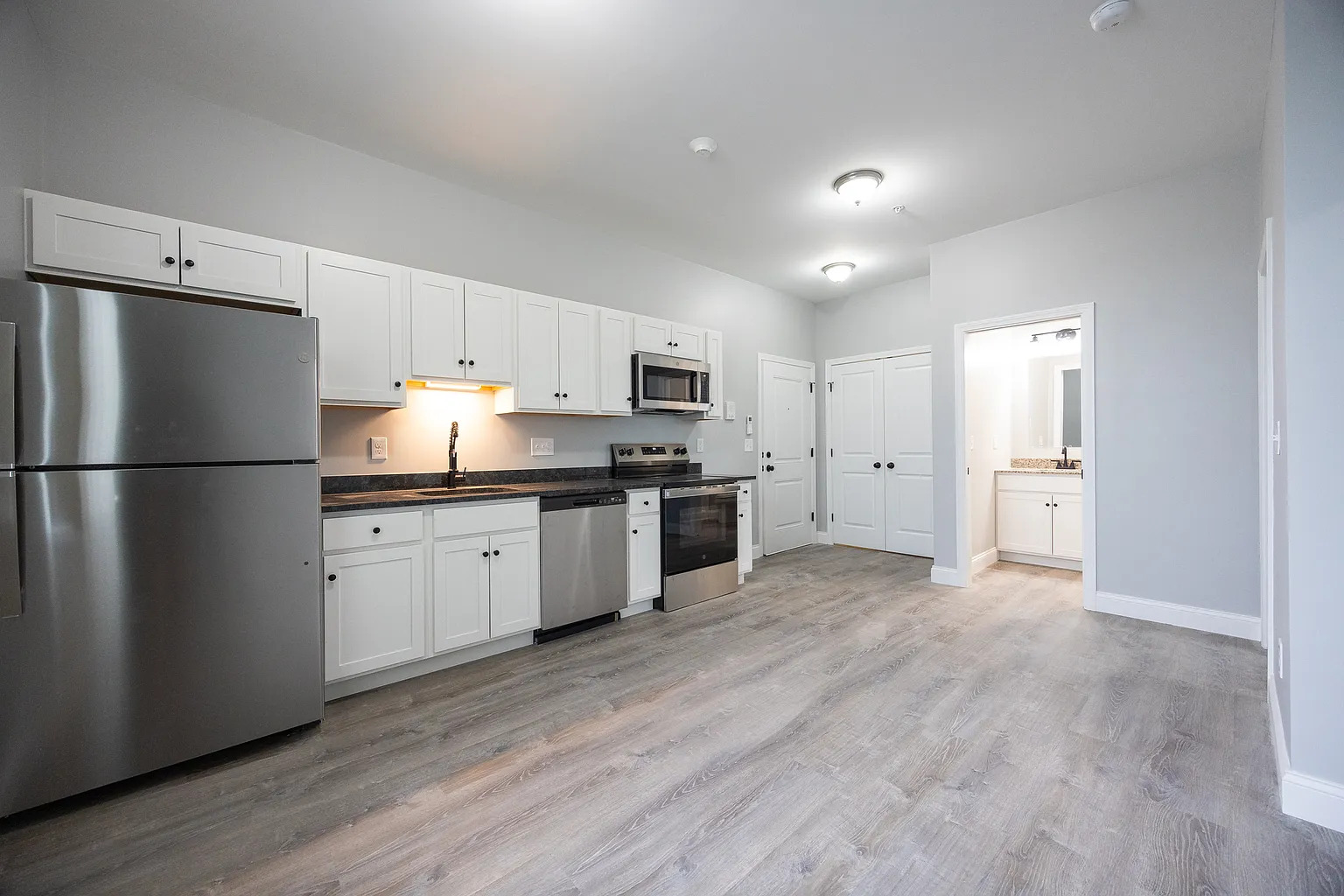 Check out this spacious one-bedroom condo in a brand-new development! It boasts granite countertops, stainless steel appliances, sleek gray vinyl plank flooring, and an energy-efficient mini-split HVAC system. The versatile bonus room is ideal for a home office, den, or guest room. Plus, you'll enjoy the convenience of an in-unit washer and dryer, as well as one assigned parking space. Pets allowed.