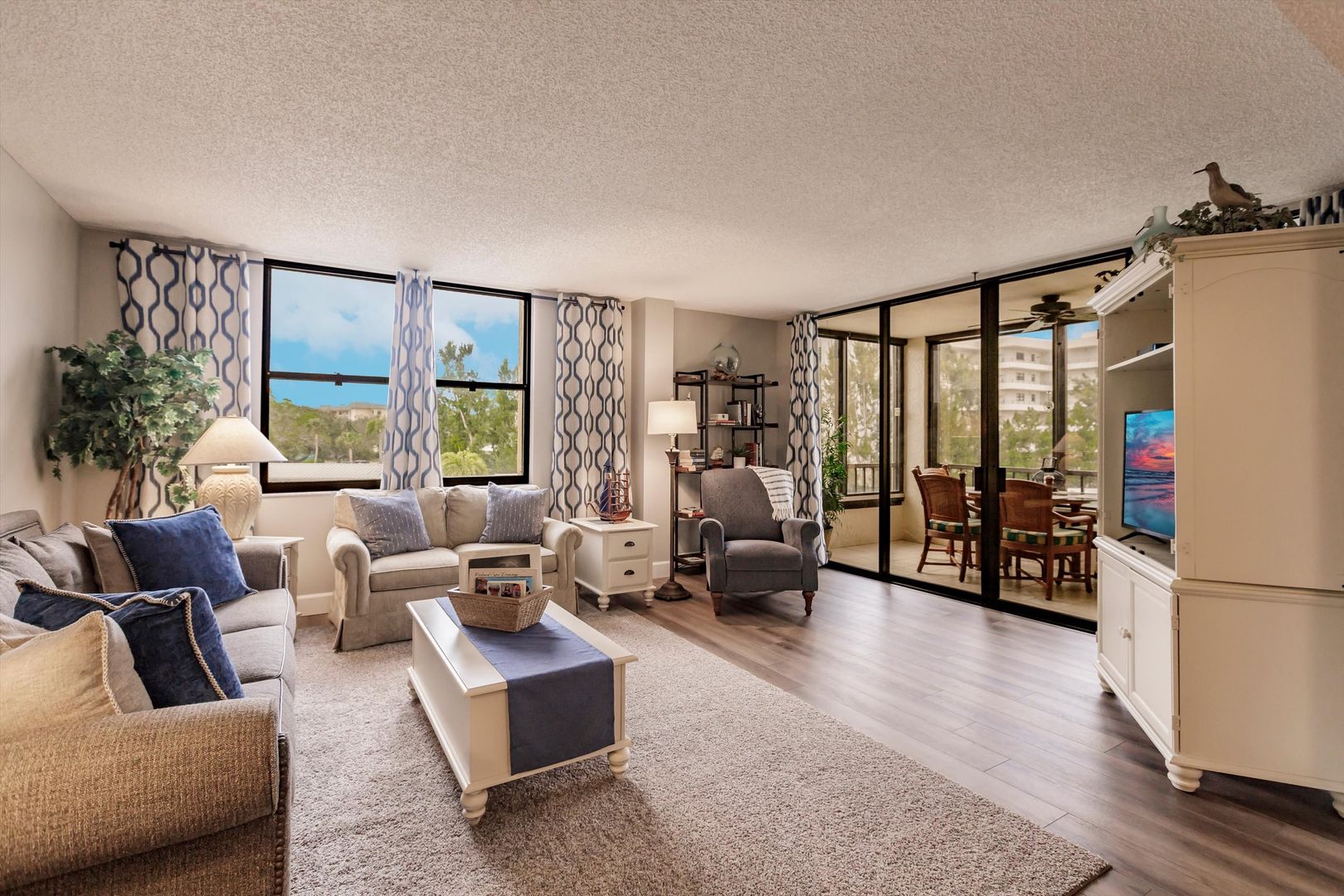 Get your second wind at A Second Wind! Newly upgraded with designer touches! Roomy, quiet and comfortable third floor condo at beautiful Island Reef. Beach-to-bay complex on the peaceful side of Siesta Key with a pool view. Two heated pools, tennis courts, pickleball and sauna. The private beach is just a five-minute walk across two-lane Midnight Pass Road with a crosswalk light. Boat dock and kayak put-in on bay side. See manatees, dolphins, ospreys and other wildlife in this great spot for fishing and water taxi pickup. Mature community and a calm, quiet atmosphere that makes it easy to relax in peace! The master bedroom has a king size bed with a spacious walk-in closet, flat screen TV and computer workstation with monitor and powerful wifi -- work from the pool! The guest bedroom has two twin beds, a wall-to-wall closet and a flat screen TV. There is a stackable washer and dryer in the utility room. Beach cabana, towels and chairs provided. Dedicated covered parking spot near the entrance. Walk to Ophelia's or Turtles Restaurant. Free public trolley to Siesta Key Village and its quaint shops and great restaurants. Sarasota's awesome museums & restaurants as well as upscale shopping at St. Armands are just a few miles away. Oh, and the sunsets are breathtaking! 1-month minimum stay. Available May 1 - Nov 1, 2024. Please message or call for booking info. 1 month minimum May 1-Nov. 1, 2024 @ $5,300 per mo. (Jan-April 2025 already booked). 1 small pet ok, no smoking in unit. Rates do not include $170 cleaning fee or state and local tax.
